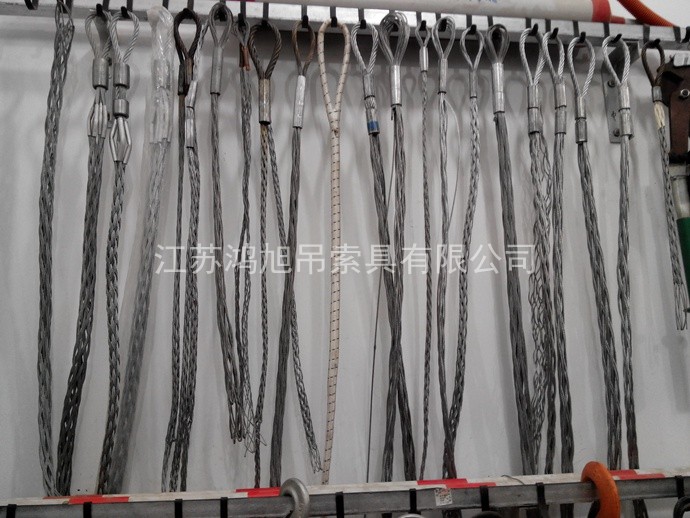 將電纜網(wǎng)套后端壓縮使之張開后套入被牽引物,逐節(jié)壓縮引繩器,逐節(jié)套入,使網(wǎng)套與電纜或油管等被牽引物緊貼,待網(wǎng)套全部套入后(可空留一段)用扎帶或鐵絲扎緊引繩器開口處.松開扎帶壓縮網(wǎng)套后端使之逐節(jié)張開,便可取出網(wǎng)套。